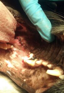 Raadpleeg meteen de dierenarts. Deze kan onder narcose veel beter in de keel kijken en kan hierdoor splinters en dergelijke verwijderen.